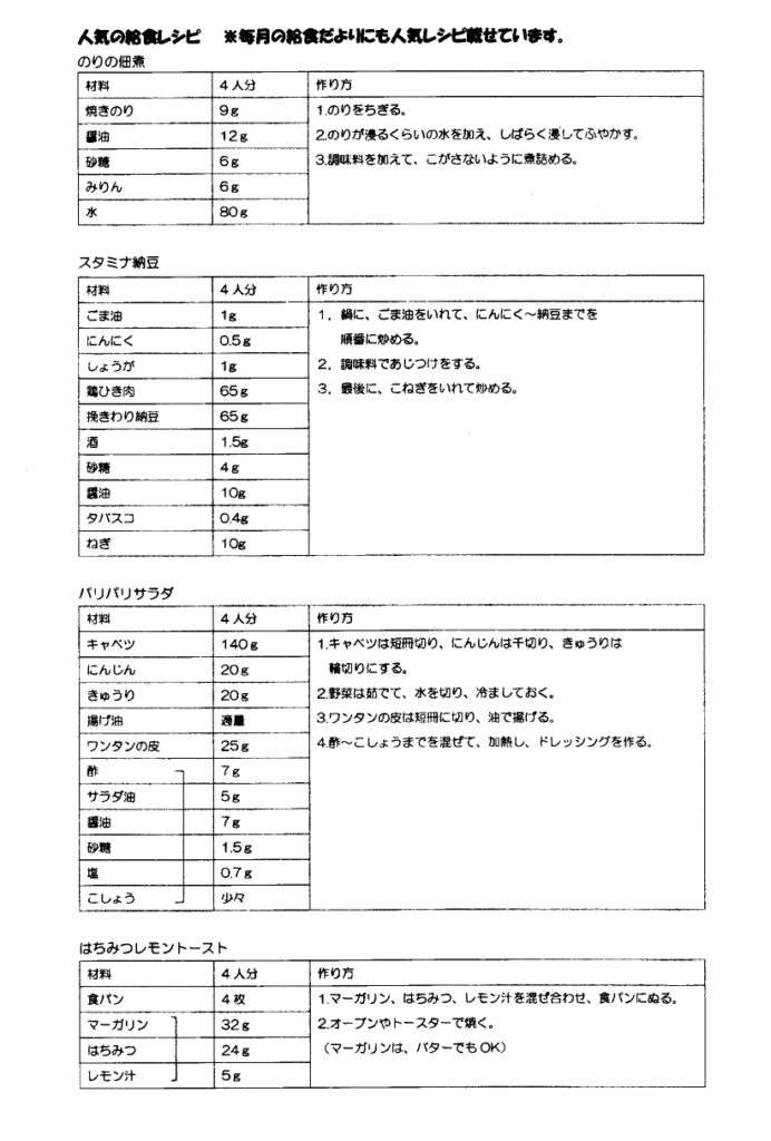 本日のメニューのレシピ、子供たちに人気のメニューレシピをいただきましたので、ご興味ある方はご覧下さい。