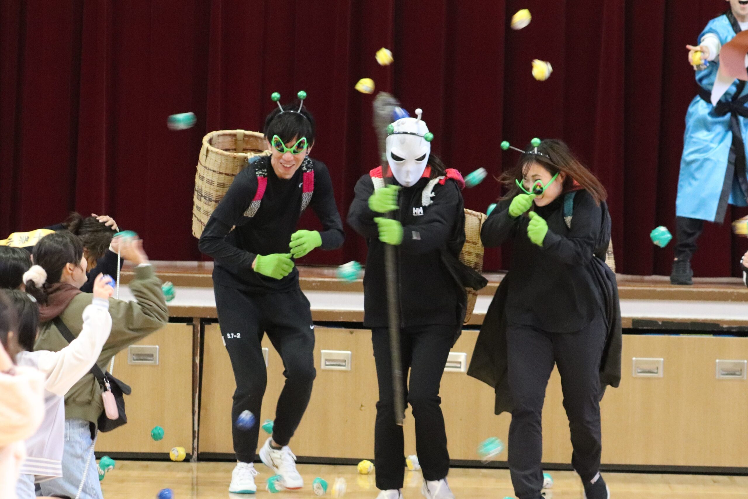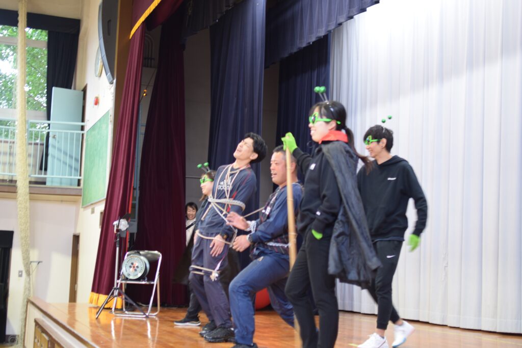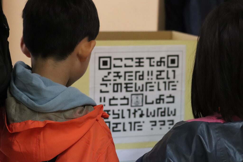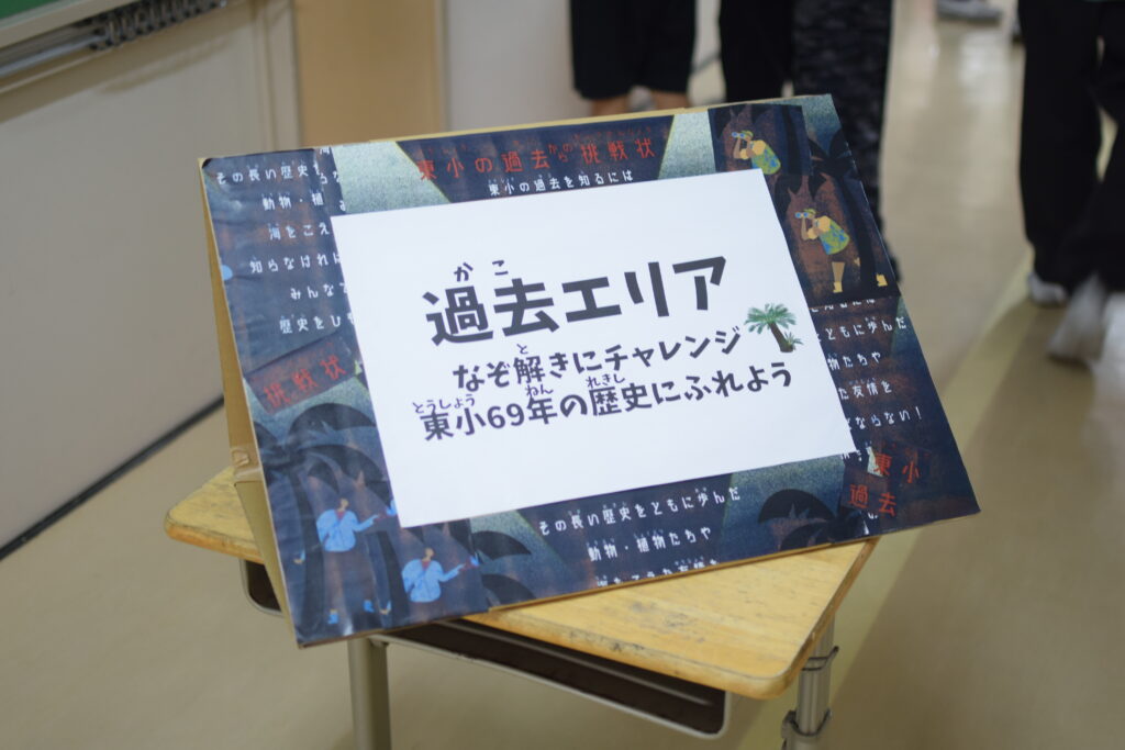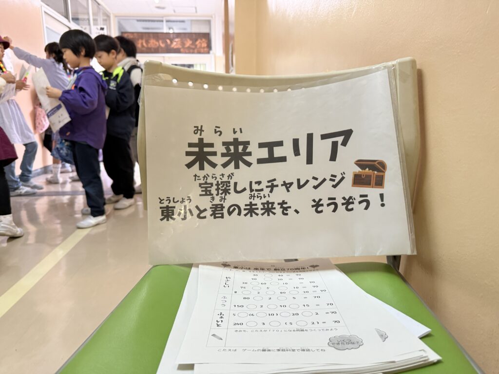 今年は来年の70周年を意識した「タイムトラベル」。校舎・体育館の「過去・現在・未来」3つのエリアで、東小の歴史紹介、謎解き、身体を使ったゲーム、宝探し等を巡るスタンプラリー。東小の未来を狙う宇宙人等に扮する先生方の迫真の演技で物語がスタート。